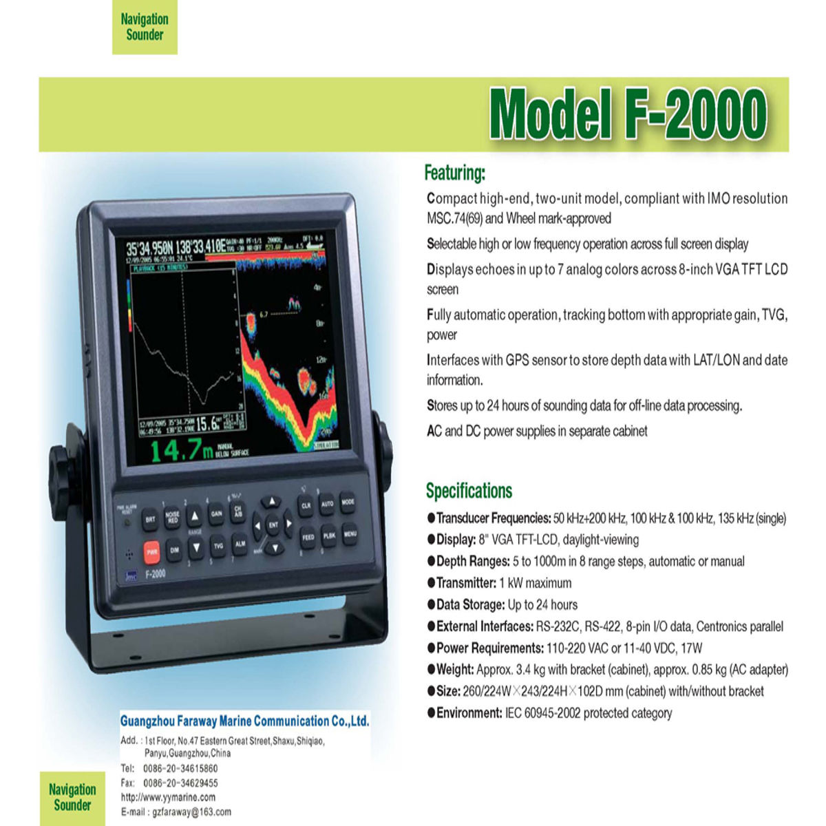 Built to meet international maritime standards, the F-2000 delivers reliable performance with automatic functions and extensive data capabilities. Its robust construction ensures continuous operation under challenging vessel motion, vibration, and changing sea conditions — making it suitable for a wide range of shipboard installations.