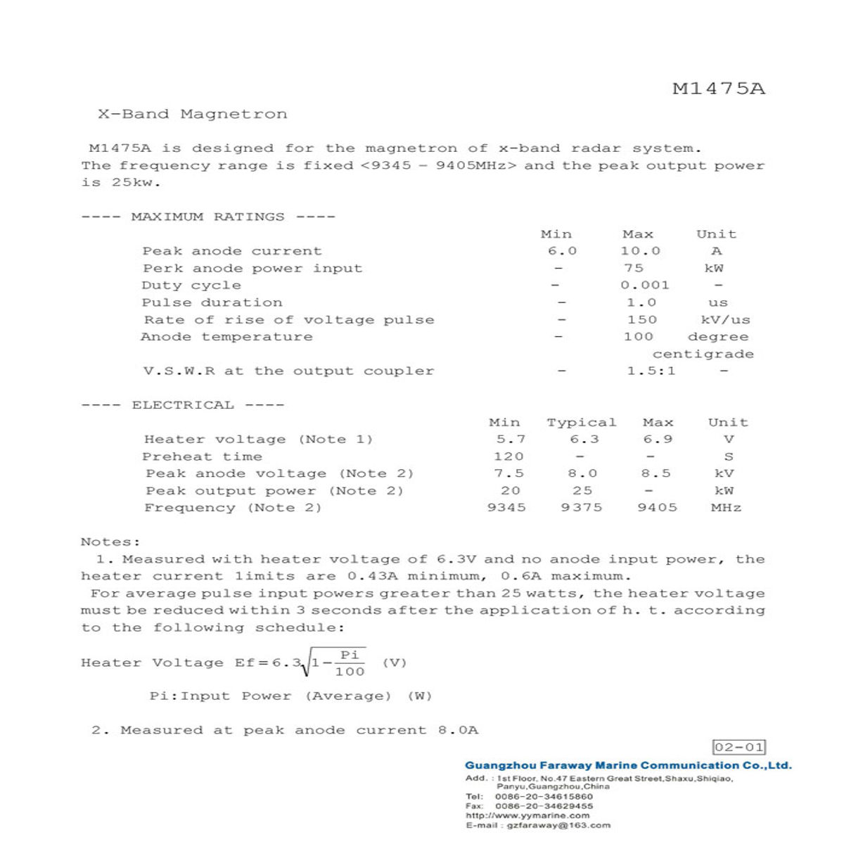 The JRC M1475A is a precision-engineered magnetron designed for use in marine X-band radar systems. Operating at a fixed frequency of 9345–9405 MHz, it delivers a powerful 25 kW peak output, ensuring clear and reliable radar detection in challenging maritime environments.