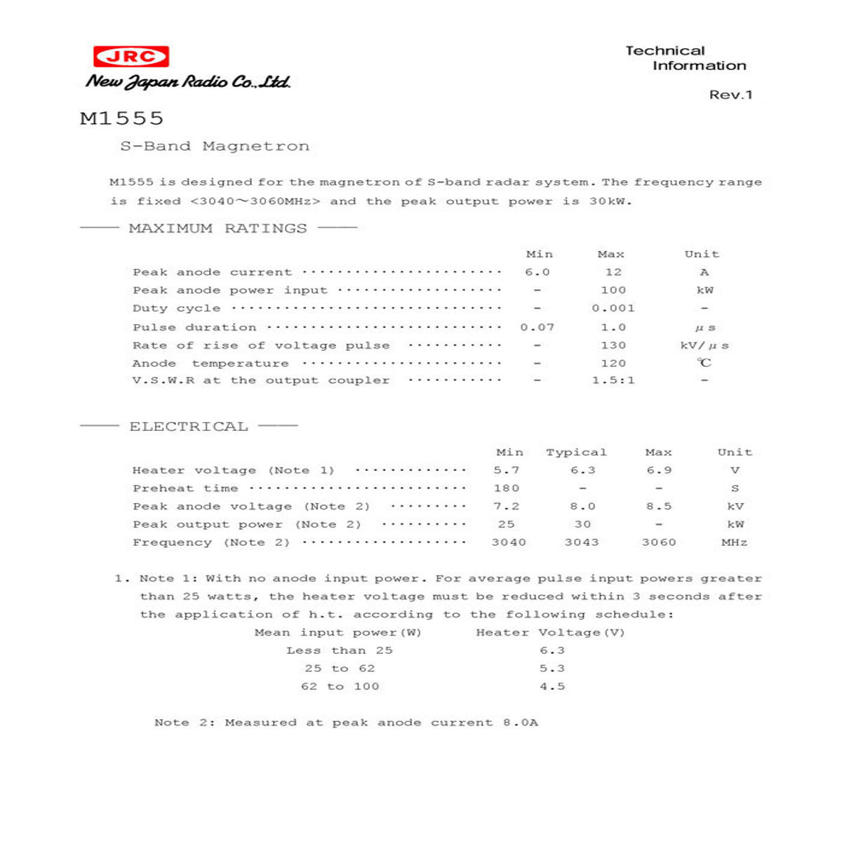 The JRC M1555 is a high-power S-Band magnetron designed for marine radar systems. Operating within a fixed frequency range of 3040–3060 MHz, it delivers a robust 30 kW peak output, ensuring superior radar detection performance in demanding maritime environments.